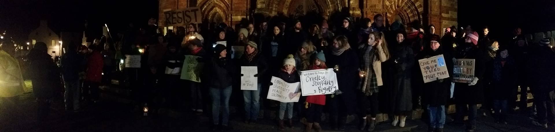 Many in the crowd carried home made banners and candles. Some came forward to speak to the crowd about why it was important for them to be there. Singing ‘we shall overcome’ the crowd slowly dispersed all, however, resolved to continue to resist Trump’s racist policies.