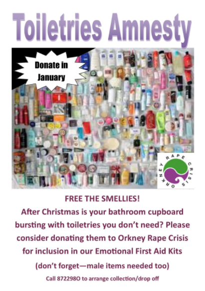 OToiletries Amnesty ORCrkney Rape Crisis are collecting donations for their ‘Toiletry Amnesty’ so that they can stock calming Emotional First Aid Kits. This is running for the whole of January and will be an annual event.