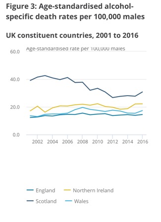 The rate of alcohol related death in Scotland is the highest level in the UK and men are the most vulnerable group. Encouragingly figures for alcohol related death in Scotland have been declining since 2006, slightly rising again recently. The steady decline suggests Scottish Government initiatives are helping, because in contrast, levels have not improved much in the other UK countries. But even with the improvements, male alcohol related death is twice as high in Scotland compared to the rest of the UK.