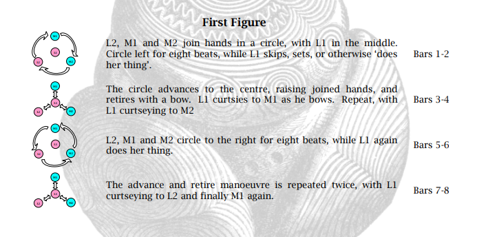 Dancers are arranged in triangular sets of two couples. The dance consists of four separate figures, the last of which is progressive. The dance would suit a 32- or 64 bar jig or reel.