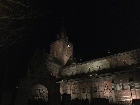 The walk assembled at 6pm on the steps of St Magnus Cathedral, Kirkwall.