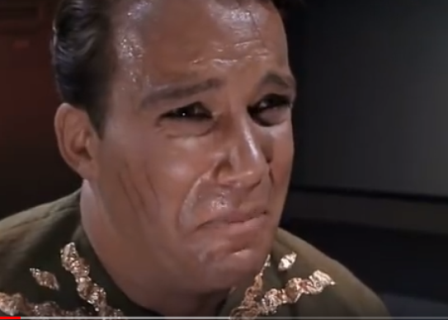 The episode’s starting sequence has the crew arrive on the planet Alpha 177 when a geology technician tumbles getting covered in a strange dust. When being beamed back it causes a reaction and the transporter is damaged but no one notices too much (EXCEPT THE MIGHTY SCOTTY!) Kirk is beamed up and immediately after he tells them to not leave the transporter room unattended, it’s left unattended and an evil duplicate of Kirk is beamed on board (you can tell he’s evil due to the music, and the way the camera focuses on his eyes and eye shadow, more proof of my evil eye shadow theory).