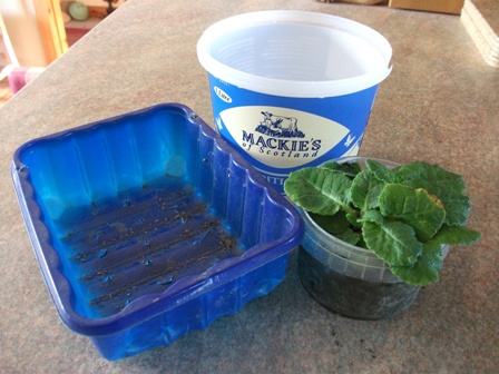 You might be wondering what this picture is about? It’s not my entry for an exhibition at the Tate Modern, or even for the Pier Arts Centre Christmas Exhibition! It’s – an empty ice cream tub, an empty supermarket mushroom tray, and one of Gavin-At-The–Bayleaf’s compostable tubs, with a primrose/primula in it – not sure which -will have to wait and see what happens in the spring!