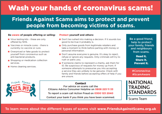 The National Trading Standards (NTS) Scams Team has produced some helpful materials to help promote scams awareness around coronavirus (COVID-19) scams at this difficult time.