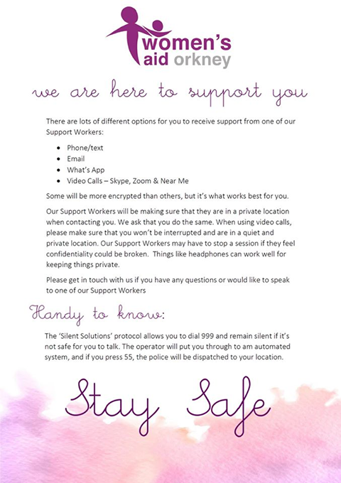 In Orkney the local Women’s Aid is open during the COVID19 restrictions.