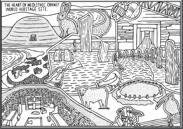 And here’s an example of one of the free colouring sheets to download. This one is the Heart of Neolithic Orkney World Heritage Site.