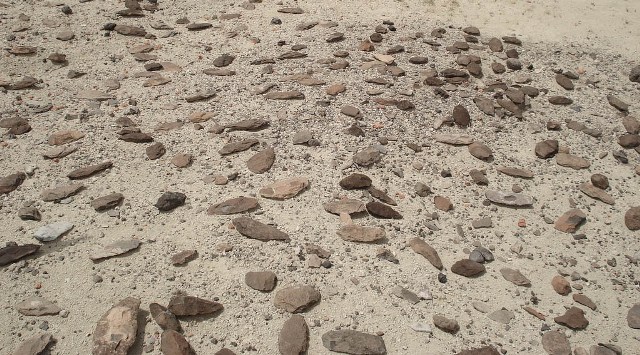 The tools, together with bones from dismembered prey, bear witness to long-term human occupation, but hominin remains themselves have yet to be discovered. The time span suggests early occupation by Homo erectus, who probably manufactured Acheulean biface stone tools in large quantities that litter the surface at some archaeological sites.