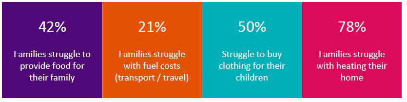 One parent described the family as living in one room, as not only was that all they could afford to heat, but the other rooms were in such a poor condition with damp and mould, that she worried constantly for her young children’s health, and that the stress and anxiety were affecting the parent’s relationship.