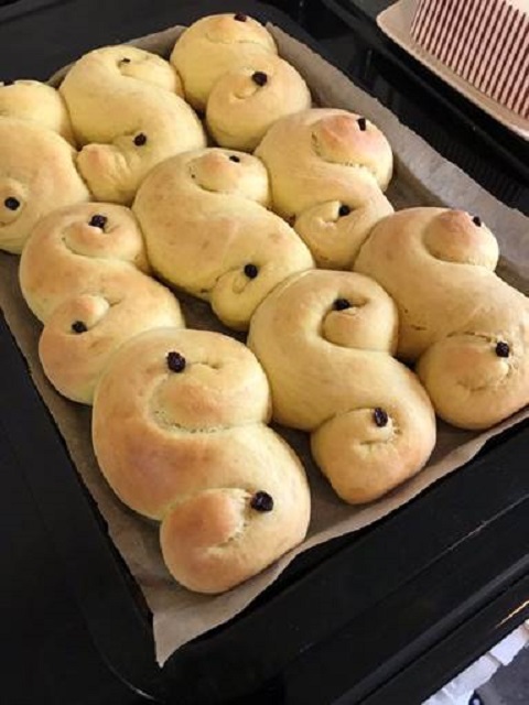 The recipe I used was the BBC Good Food one – just because of what I had in, I used plant-based milk and ‘butter’ and it all worked beautifully. https://www.bbcgoodfood.com/recipes/st-lucia-saffron-buns. A Swedish friend advised grinding the saffron with little of the sugar, to distribute it better, which I did.