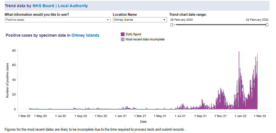 From 14th to 20th February where were 363 positive cases in Orkney, that’s a rate of 1,620.5 per 100,000 population (Scottish Average rate is 789.2 per 100,000)