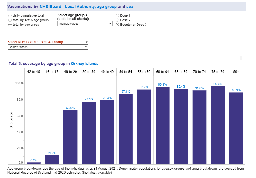 This graph illustrates the vaccination % for the third (booster) jag for age groups in Orkney.