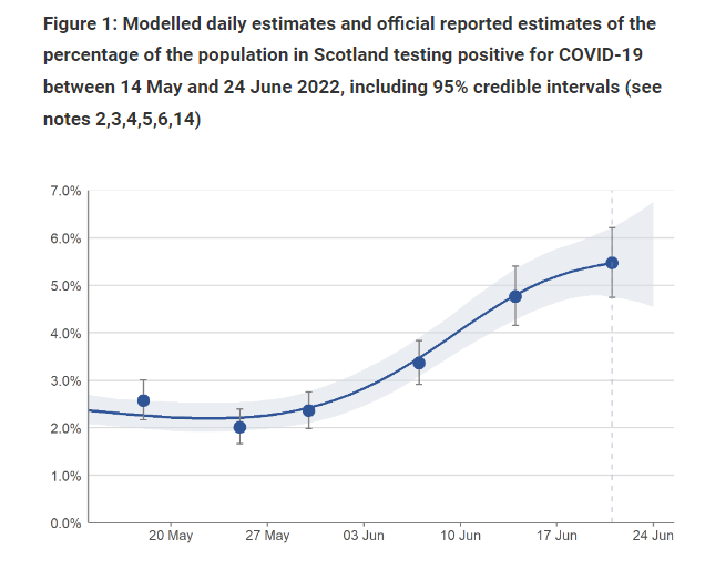 In Scotland (18 to 24 June 2022) the estimated percentage of people testing positive for COVID-19 in Scotland was 5.47%. It is estimated that 288,200 people in Scotland had COVID-19 at any given time that week.