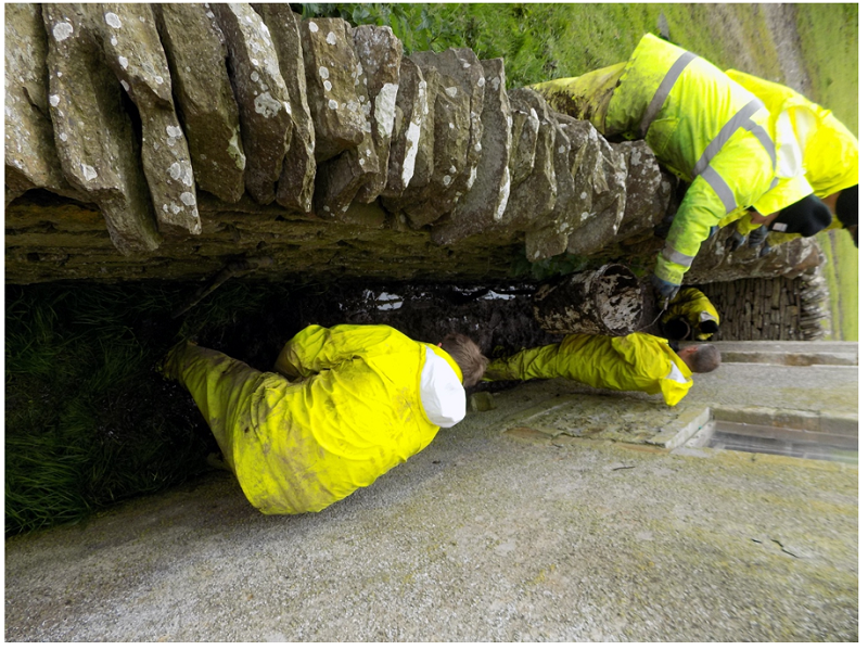 JRS volunteers have located the outflow drain on the west side of the Hall. It is blocked with silt meaning that the ‘dry’ moat does flood at times. If it can be unblocked, the moat will drain and the Hall’s ground floor dry out considerably. The drain stones entering this outlet were cleared and they are of exceptional quality.