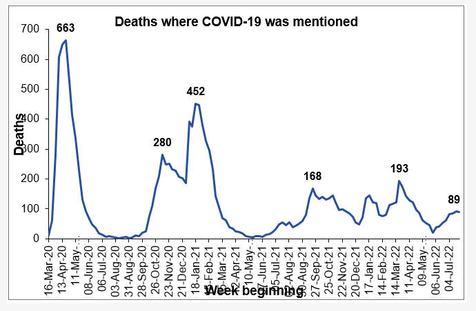 2022 week 30: 89 Covid related deaths, Covid was the main cause of 50 of those deaths. Deaths due to all causes was 1,169, 152 more than the 5 year average