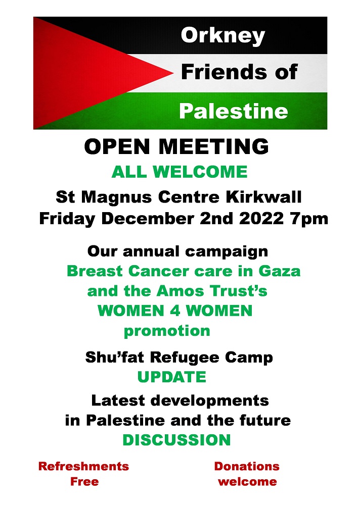 The Orkney Friends of Palestine are hosting a meeting on Friday 2nd December at 7pm in the St Magnus Centre, Kirkwall.