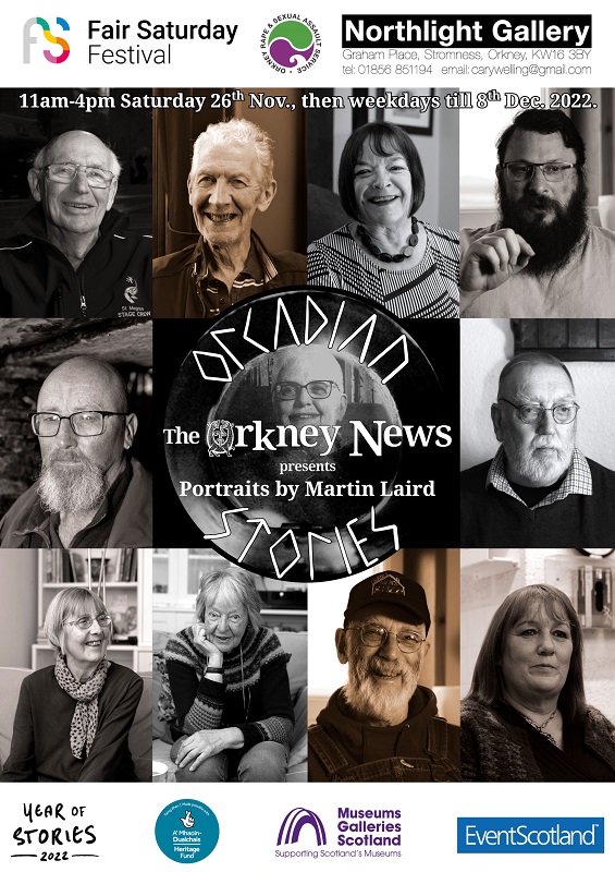 Martin Laird’s exhibition of portrait photographs of islanders featured in his latest film ‘Orcadian Stories’ opens today, Saturday 26th of November at the Northlight Gallery Stromness.