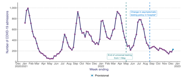 In the latest week ending 11 December 2022, there were 229 new COVID-19 admissions to hospital. Hospital admissions for the most recent week are provisional and should be treated with caution. At the time of publication there were no data available for two NHS Boards, and the previous week’s figures have been rolled forward.