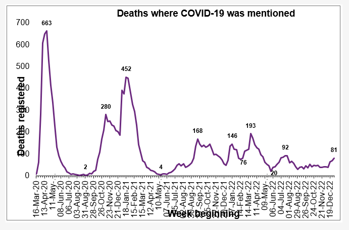 - In week 01 there were 81 deaths involving COVID-19 (13 more than the previous week).