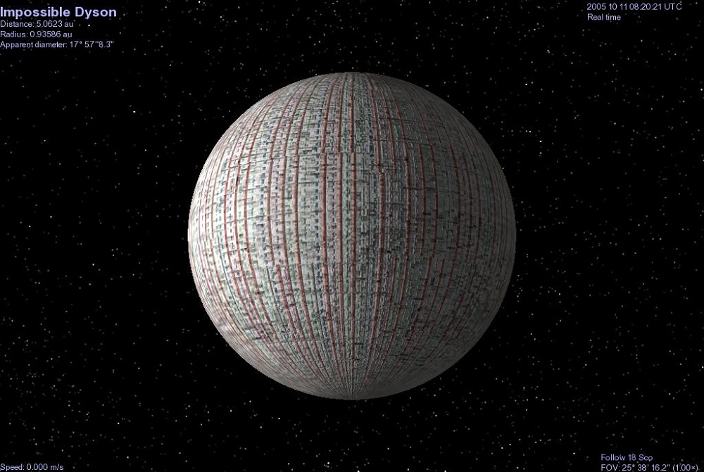 Prof. Nikolai Kardashev postulated that there are three SETI-related levels of high-technology civilisation: Type 1 controls the matter and energy of a planet, Type 2 the resources of a Solar System, and Type 3 the resources of a galaxy. (N.S. Kardashev, ‘Transmission of Information by Extraterrestrial Civilisations’, in G.M. Tovmasyan, ed., Extraterrestrial Civilisations, Israeli Program for Scientific Translations, 1967.) The ultimate example of a Type 2 is generally taken to be Prof. Freeman Dyson’s suggestion that an advanced civilisation might break up the planets of its solar system and build a shell around its star, to utilise all the matter and energy available to it (Fig. 1) – hence the late Chris Boyce’s title for it, which I’ve used as my heading. (F.J. Dyson, ‘Search for Artificial Stellar Sources of Infrared Radiation’ (Science, Vol. 131, 1959, reprinted in A.G.W. Cameron, ed., Interstellar Communication, Benjamin, New York, 1963.)