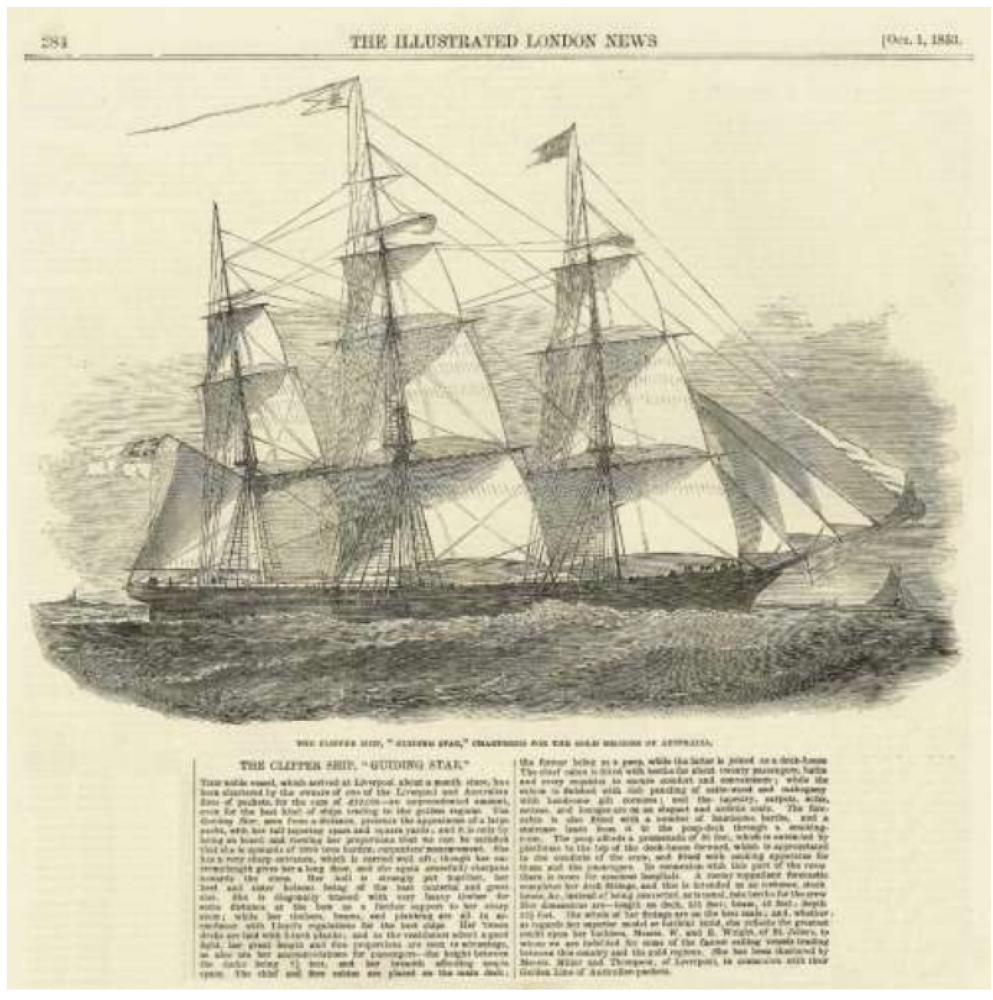 The ship James and Rebecca boarded on their way to fulfil their dreams of a new life in Australia was the full-rigged clipper Guiding Star. This 1470 ton, 233ft (71m) clipper, which had been built at St John’s in Canada just 2 years previously, epitomised all the best in design and safety, with passenger comfort being given higher priority than many ships of that time. Her previous voyage to Melbourne had been achieved in 70 days, this at a time when the average voyage time would have been in excess of 100 days, with the return journey being noted as the second fastest trip on record.