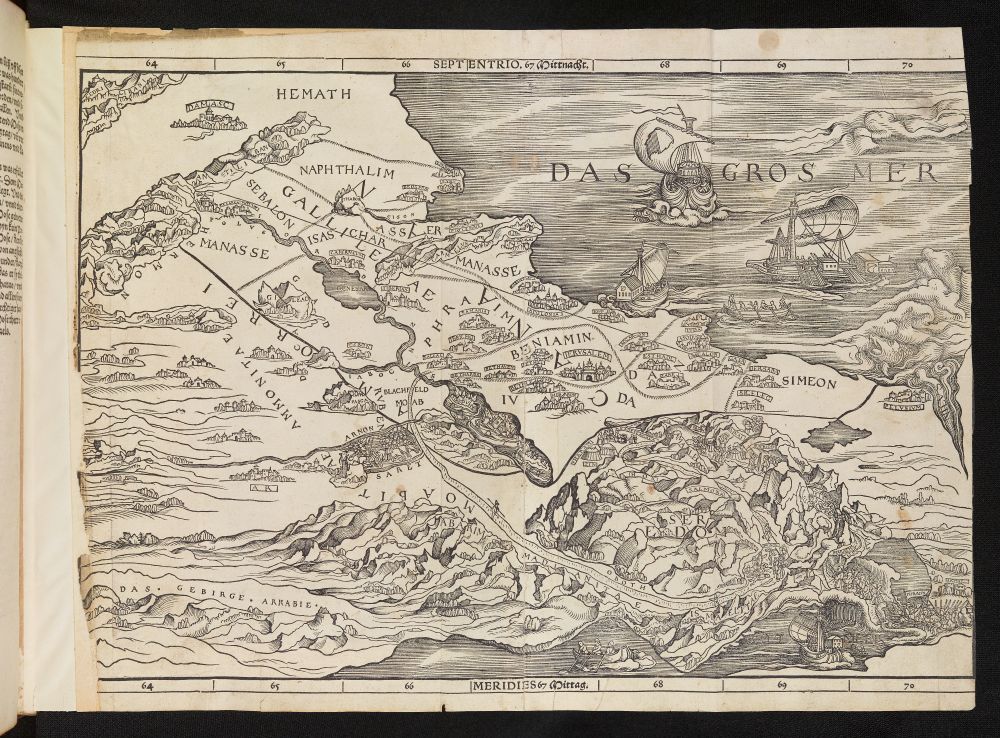 “They printed the map backwards so the Mediterranean appears to the east of Palestine. People in Europe knew so little about this part of the world that no one in the workshop seems to have realised. But this map transformed the Bible forever and today most Bibles contain maps.”